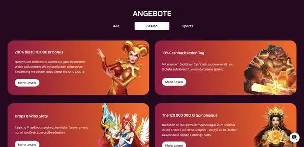 Wenn Sie nach einem HappySpins Casino Bonus ohne Einzahlung als VIP-ähnlichem Vorteil suchen, prüfen Sie bitte zuerst die Promotions-Seite. Wenn es spezielle Angebote gibt, werden sie mit Gültigkeitsdaten und Berechtigungsregeln angezeigt. So bleiben Ihre HappySpins Bonus-Optionen konsistent und Missverständnisse beim Auszahlen werden vermieden.